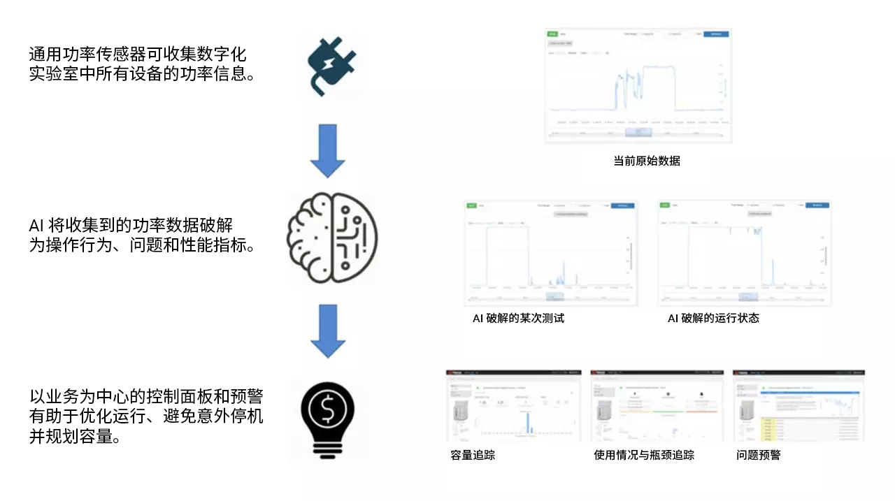 将 AI 与通用监测功能结合用于检测和监控一系列变量(例如仪器的功耗),使公司能够为其业务实现一定的运营和财政收益并制定未来计划。通过高质量且可轻松获得的见解,AI 可以同步监测实验室中所有设备的使用情况并进行整体容量追踪。