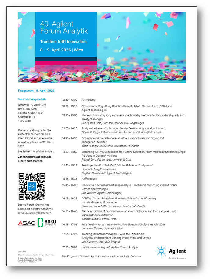 For four decades, the Agilent Forum Analytik has served as a collabortive event for Austria’s analytical chemistry community, bringing together researchers, industry leaders, and emerging innovators to exchange ideas and explore the future of science. On April 8–9, 2026, Agilent will mark the 40th edition of the Agilent Forum Analytik in Vienna—celebrating a long‑standing tradition while spotlighting the innovations shaping modern analytical workflows.