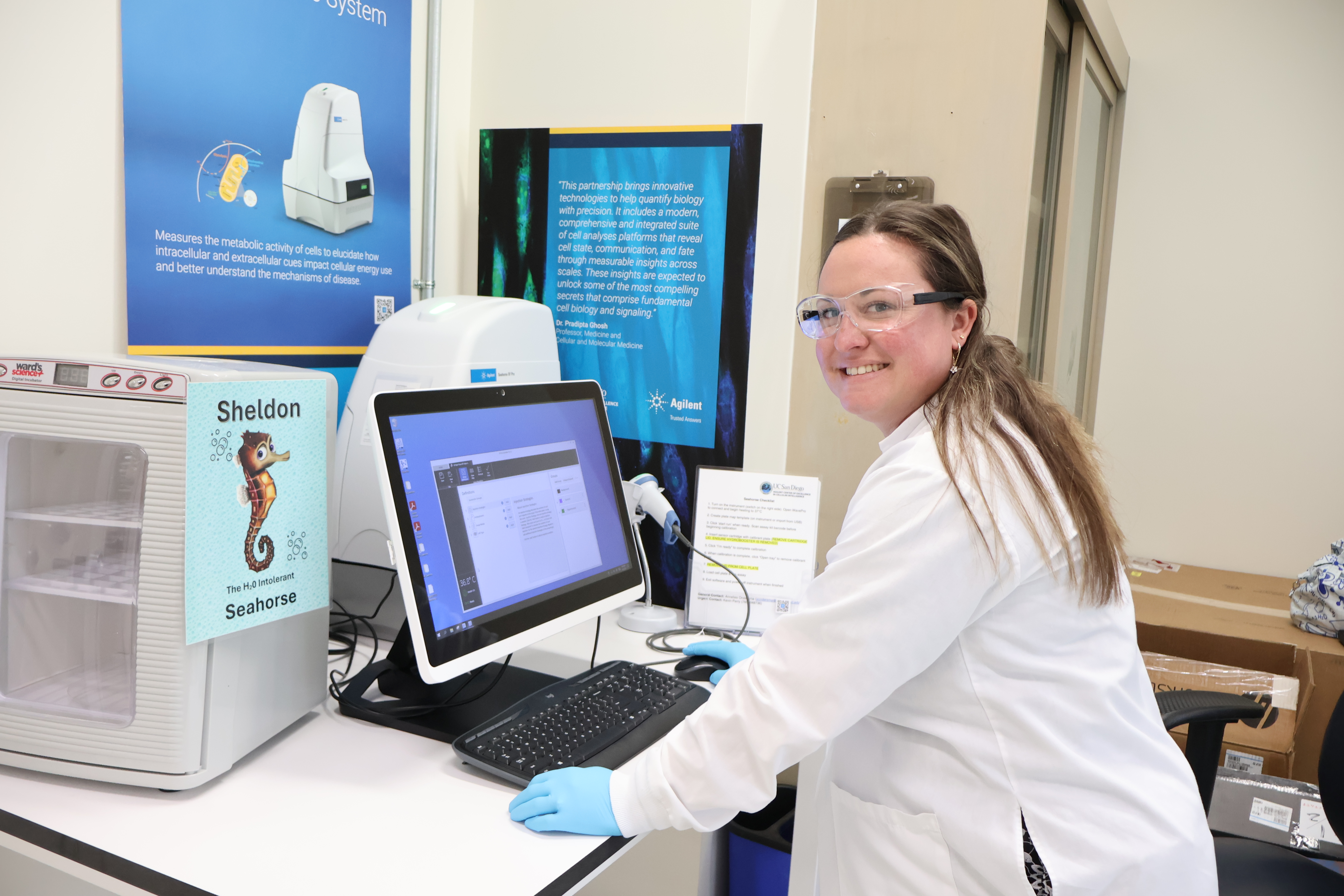 Courtney Tindle, Program Manager and Director of Operations, HUMANOID Center of Research Excellence (CoRE) from UC San Diego, UC San Diego HUMANOID: Center of Excellence in Human Organoid Research, and UC San Diego Agilent Center of Excellence in Cellular Intelligence, has affectionately named her Agilent Seahorse, Sheldon. After the beloved H2O-intolerant seahorse from Finding Nemo.