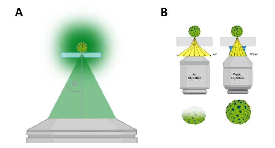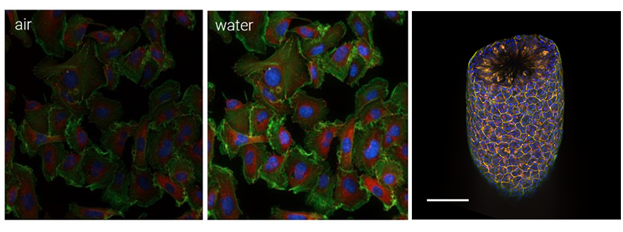 Fluorescence light microscopy is a powerful tool that provides spatial insight into biological processes. Water immersion objectives capture more light than air objectives, a trait that is especially useful in imaging workflows where the sample is typically contained within an aqueous solution and can be two-dimensional (2D) or three-dimensional (3D). This enhanced light capture property leads to several key advantages and benefits that overcome the challenges of imaging 3D and other thick samples.