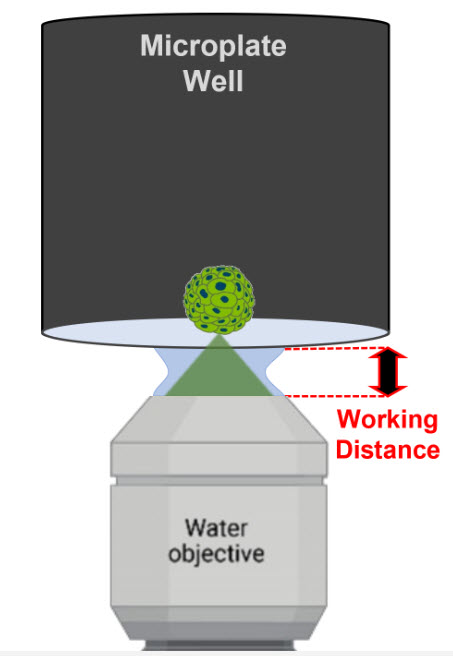 Water immersion objectives are well suited for thin samples, such as adherent cells or histological sections, because these objectives tend to have a shorter working distance. For example, the working distance of the 60X water immersion objective compatible with the Cytation C10 is 280 µm, whereas its air counterpart has a working distance of up to 2.2 mm. However, it is still practical to image thicker samples such as spheroids, organoids, or superficial regions of tissue. To successfully image these types of samples with a short working distance objective, ensure that the sample is as close to the imaging interface (e.g., coverslip or well bottom) as possible.