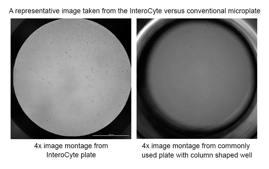 Many image-based workflows that are commonly performed across a wide range of research areas include examining how target cells proliferate. A common desire is the ability to properly image and analyze all cells in the well to accurately assess the efficacy or potential toxicity a test molecule has on the target cells. Microplates commonly used in research today incorporate a column-shaped well, which complicates this goal, due to the dark shadow seen around the well edge from the liquid meniscus. The effect makes accurate cell count or confluence measurements nearly impossible. Agilent InteroCyte shadow-free imaging microplates was developed to alleviate this problem. The unique well design eliminates the shadow caused by the meniscus from the imaged area which contains the cells.