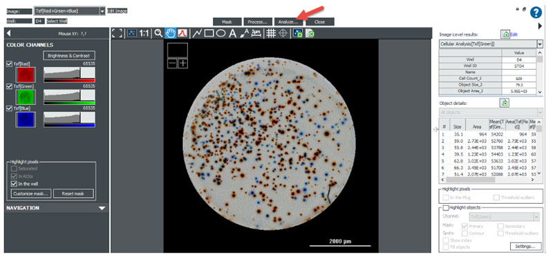 To conduct the 2-color ELISpot assay, the prepared PVDF membrane backed plate is color brightfield imaged in the same manner as a standard colorimetric ELISpot assay. After imaging and background subtraction, spots are identified using threshold and size analysis of the Tsf[Green] channel.