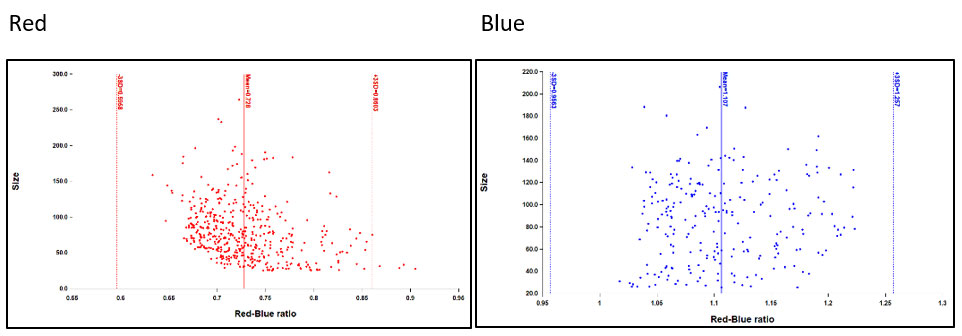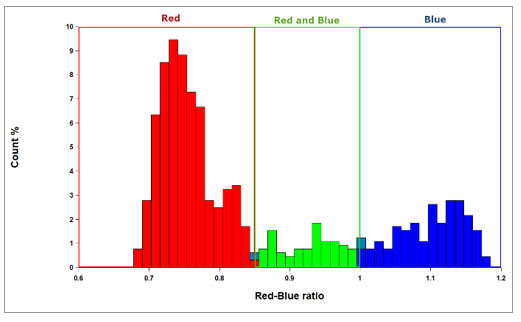 Figure 2. The population mean plus 2-3 standard deviations of a red-only well can be used to define the upper threshold of the ratio for red spots. Likewise, the population mean minus 2-3 standard deviations can be used to define the lower limit of blue spots. Spots with ratio values in between red and blue would be considered a mix of the two colors.
