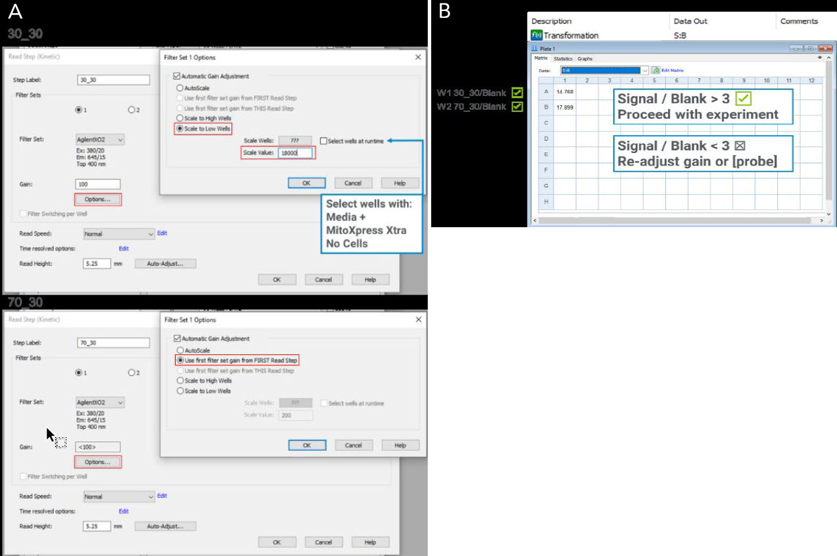 Signal and gain optimization are crucial for optimal assay performance when running an Agilent MitoXpress or pHXtra soluble metabolic sensor assay for the first time. As further described in the kit User Guides, the ratio of the signal from a well containing the metabolic sensor and a blank well (S:B) is used as a metric to estimate whether the optimal settings were chosen.