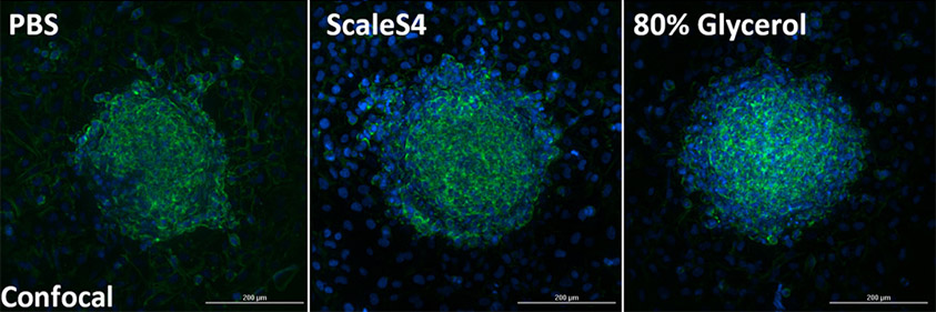 Figure 1. Comparison of clearing methods using adhered HT1080 Spheroids. HT1080 spheroids were formed by seeding 1000 cells into ultra low attachment (ULA) U-bottom 96-well plates (Corning Cat# 4520) and allowed to coalesce for 24 hours at 37°C. Spheroids were then transferred to clear, flat-bottom 96-well plates (Agilent Technologies Cat# 204626) (1 spheroid/well) and allowed to settle and establish adhesion at RT for 1 hr. Plates containing spheroids were then transferred back to the 37°C incubator to allow spheroids to attach to the culture area and spread overnight before fixing samples with 4% PFA for 30 min, then permeablizing with 0.5% for 1 hour. To achieve full penetration of dyes, spheroids were stained with Hoechst 34580 and Alexa Fluor 488-phalloidin overnight at 4°C. Spheroids were then washed, and PBS was either maintained, or exchanged for either the ScaleS4 (40% D-Sorbitol, 10% Glycerol, 4M Urea, 15% DMSO, 0.5% n-Propyl Gallate, 0.05% NaN3), or a homemade mounting medium (80% glycerol, 20 mM Tris, pH 8.0, 0.5% n-Propyl Gallate, 0.05% NaN3). Confocal z-stack images of fixed and stained HT1080 Spheroids were captured at 40X using the Cytation C10 Confocal Imaging Reader and projected as a single image.