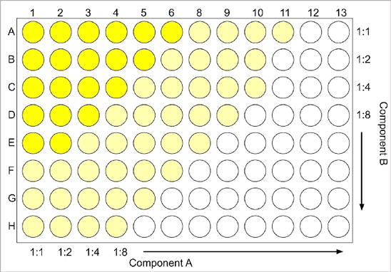 A final step in optimization of the assay itself is to empirically determine the proper concentration and incubation period for the remaining components. Commonly this is accomplished by creating a two-way, or checkerboard titration, where one component is titrated across the plate, and a second is titrated down the plate (Figure 1).