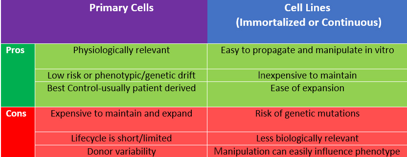 Cell Type Selection There are two broad categories of cells used in culture: either immortalized cell lines or primary cells, and there are pros and cons to both cell types. Whichever cell type you choose, using cell lines to standardize and confirm your experiments, while further validating with primary cells and using them as controls for those experiments, is key. Starting with a trusted cell line source is also crucial to success. You can obtain validated cell lines from clear lineages from a variety of repositories including ATCC, Riken Biomedical Institute and Coriell Institute for Medical Research. These also now include some fantastic tools including CRISPR/Cas9 and fluorescently labeled cell lines.