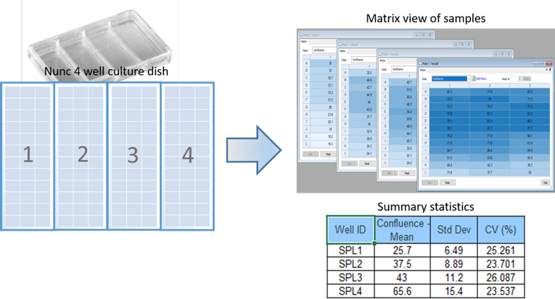 Large cell culture areas, such as T75 flasks or multiwell dishes, can be quickly imaged and analyzed to determine the average cell density and variance across the culture area (Figure 2).