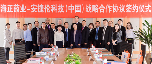 安捷伦科技高级副总裁兼生命科学与应用市场集团总裁Patrick Kaltenbach先生、安捷伦科技副总裁兼实验室解决方案大中华区总经理陈亮先生与海正药业董事长白骅先生于海正药业新建的富阳研发基地共同出席了签约仪式。