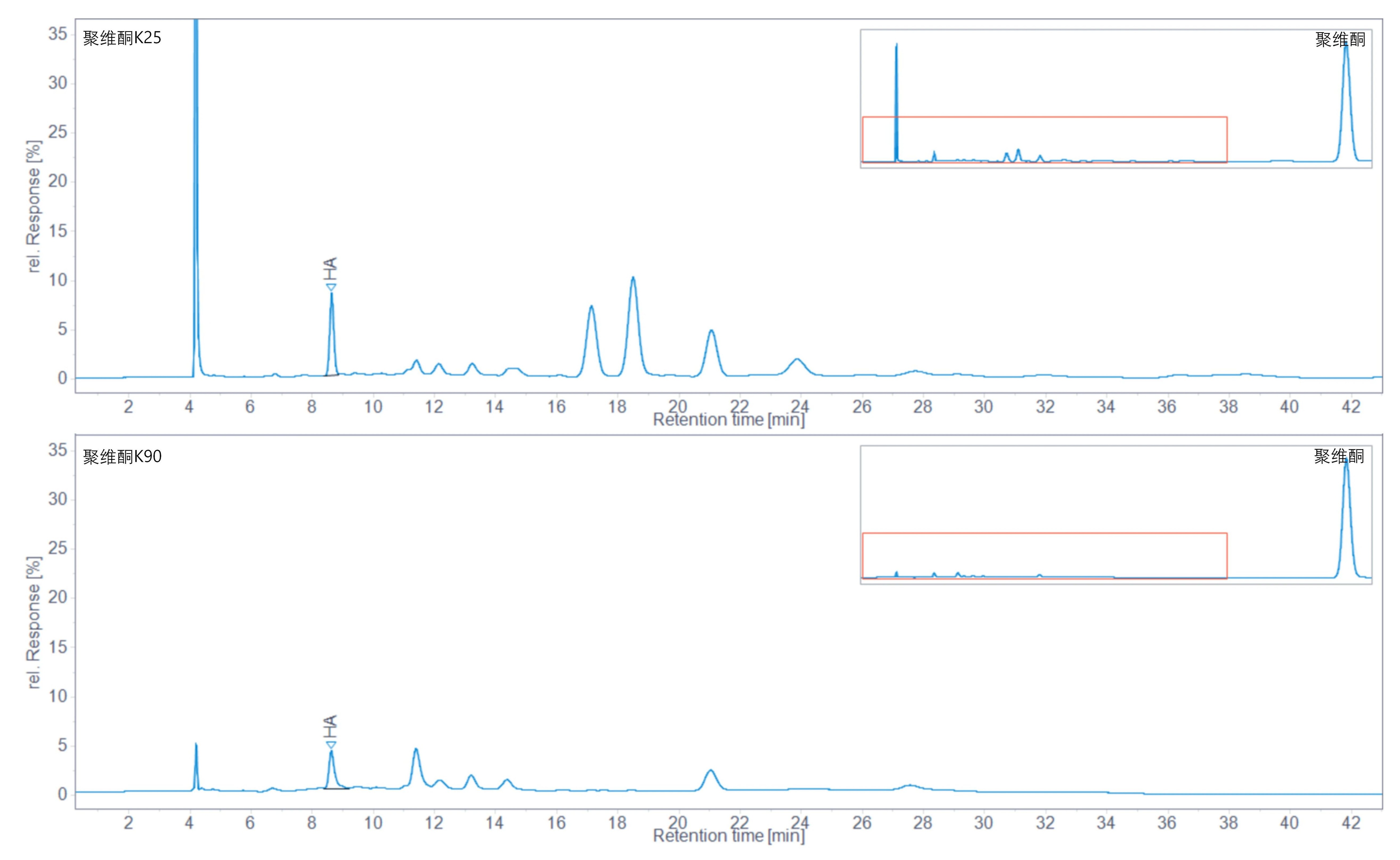 采用 Online SPE 方案运行聚维酮样品溶液,同时实现将样品离线 SPE 处理方式在线化和自动化。以聚维酮 K25 样品为例,Online SPE 方案将主成分聚维酮快速反冲至废液,使其分析时间缩短至 20 分钟。