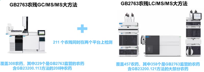 新标准与 2018 年 6 月发布的 GB23200.113-2018 食品安全国家标准 《植物源性食品中 208 种农药及其代谢物残留量的测定 气相色谱-质谱联用法》相互补充,共同检测 421 种农药,其中 118 种是 LC/MS/MS 或 GC/MS/MS 都可以分析的农药,303 种农药化合物需要分别在 GC/MS/MS 和 LC/MS/MS 上完成检测。
