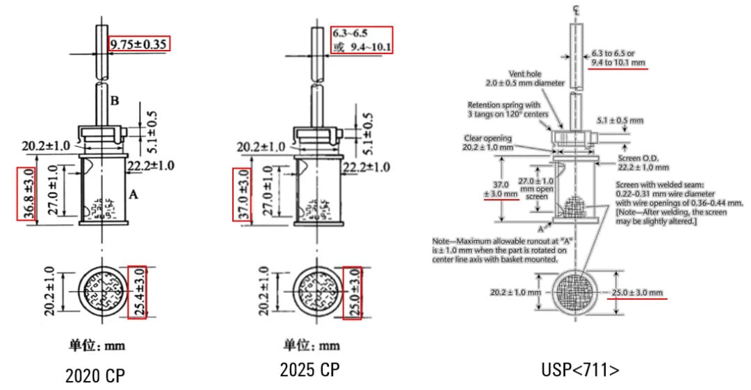 2025 版药典对转篮参数进行了调整,具体调整内容包括 篮体钢圈外径和篮体高度范围,并且特别提到了 镀金涂层的设计要求。杆直径新增 6.3mm-6.5mm 规格。篮法参数更新后, 2025 版药典中转篮相关参数要求和 USP<711> 中对应内容表述完全一致。