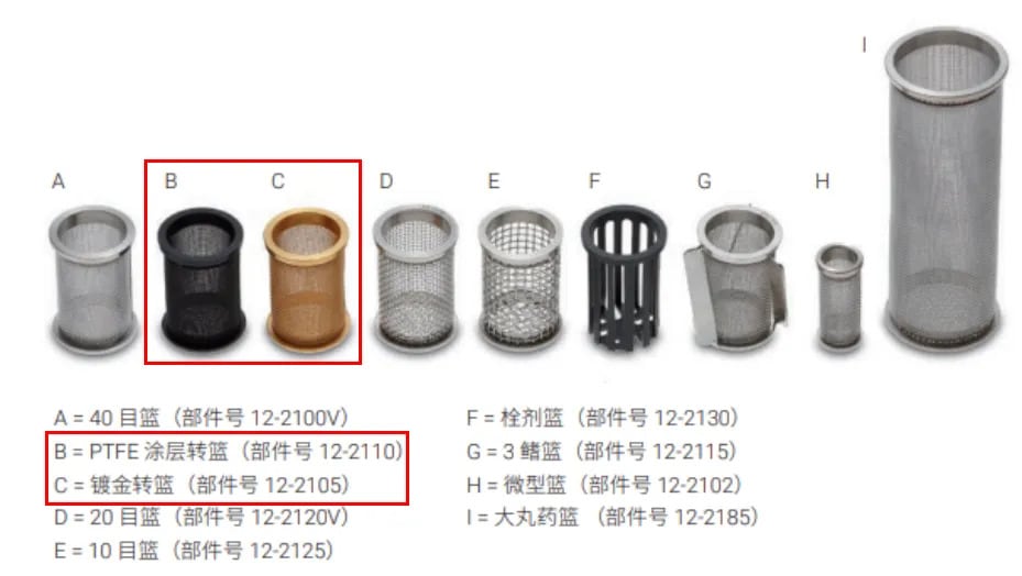 新版药典中新增镀金涂层描述,其设计主要用于解决溶出实验过程中因转篮材质引起的吸附或干扰问题。 安捷伦提供多种材质和规格的转篮,涵盖镀金涂层、特氟龙涂层等不同类型,可满足多样化的实验室需求。