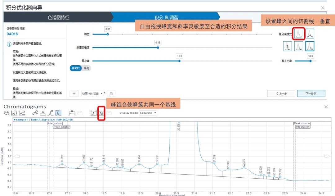 a 自由拖拽峰宽和斜率灵敏度的数值;b 直观的选择不同峰与峰之间的切割线,垂直、斜切、高斯撇去等;c 通过峰组合使未能基线分离的一组峰共同基线,而不会出现积分线分段或者未拉平的情况。