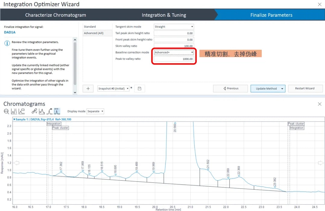 对于分离不佳、峰宽较大的情况,通常容易观察到多个垂线,Advance+ 基准线将多个落肩合并为一个肩峰。